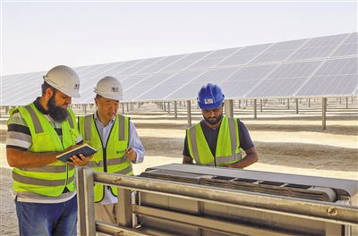 由中國企業(yè)總承包的阿聯(lián)酋艾爾達芙拉光伏電站可供20萬戶居民用電,每年減少二氧化碳排放240萬噸,使清潔能源在阿聯(lián)酋總能源結構中的比重提高到13%以上。圖為中外員工在艾爾達芙拉光伏電站工作。