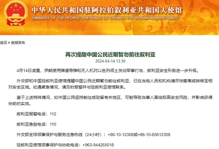 使館消息稱,4月14日凌晨,伊朗使用彈道導(dǎo)彈和無人機(jī)對以色列領(lǐng)土發(fā)動軍事打擊,敘利亞安全形勢進(jìn)一步升級。
