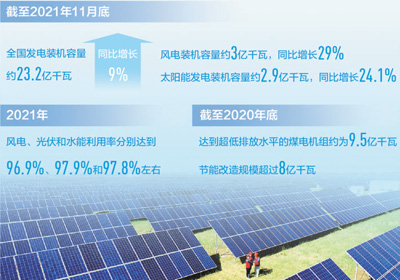近年來,我國風電、光伏等可再生能源裝機規(guī)模持續(xù)擴大。截至2021年11月底,全國發(fā)電裝機容量約23.2億千瓦,同比增長9%。其中,風電裝機容量約3億千瓦,同比增長29%;太陽能發(fā)電裝機容量約2.9億千瓦,同比增長24.1%。