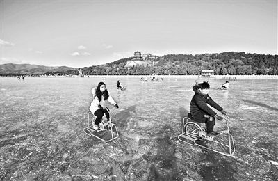 頤和園冰場(chǎng)的景色絕佳,冰場(chǎng)四周環(huán)繞著頤和園的亭臺(tái)樓閣,游客在冰面滑行的過(guò)程中,可切身感受到古人造園“步移景異”的精妙之處。冰上賞景的最佳選擇是騎行冰上自行車,冰上自行車幾乎對(duì)技術(shù)零要求,因?yàn)橛薪饘倏蚣艿闹?,騎行時(shí)比普通自行車還要平穩(wěn),冰上自行車可快可慢、可停可站,游客呼吸著清冽的空氣,眼前則是高大雄偉的佛香閣與遼闊的西山群峰,盡管腳下在奮力地蹬車,在不知不覺(jué)間已融入到頤和園的山水畫卷之中。