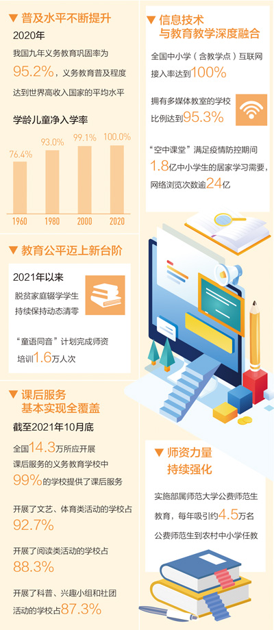 黨的十八大以來(lái),在以習(xí)近平同志為核心的黨中央堅(jiān)強(qiáng)領(lǐng)導(dǎo)下,我國(guó)義務(wù)教育取得了舉世矚目的成就:2020年,我國(guó)九年義務(wù)教育鞏固率為95.2%,義務(wù)教育普及程度達(dá)到世界高收入國(guó)家的平均水平;實(shí)施義務(wù)教育薄弱環(huán)節(jié)改善和能力提升項(xiàng)目,發(fā)展“互聯(lián)網(wǎng)+”教育助力城鄉(xiāng)教育均衡,全國(guó)義務(wù)教育基本均衡已經(jīng)全面實(shí)現(xiàn)……讓適齡兒童少年有學(xué)上、上好學(xué),讓每個(gè)孩子都能享有公平而有質(zhì)量的教育,正在成為現(xiàn)實(shí)。