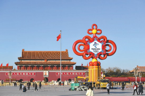 昨天,天安門廣場又添新景。一個鑲嵌有2022冬奧會會徽的巨型中國結正在安裝。中國結整體呈紅色,中心鑲嵌一片藍白相間的雪花,雪花正中是2022冬奧會會徽,為迎接春節(jié)和冬奧營造喜慶氛圍。 本報記者 鄧偉攝
