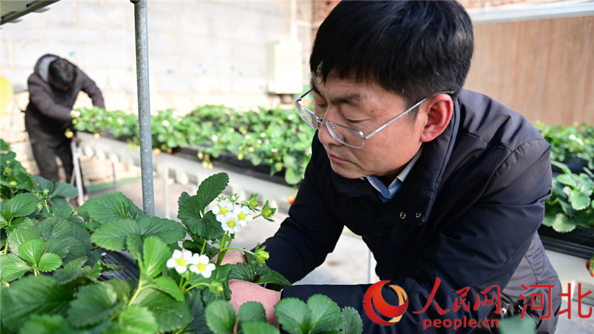 曲陽縣晾甲山現(xiàn)代農(nóng)業(yè)園區(qū)草莓大棚內(nèi),園區(qū)負(fù)責(zé)人段少輝正在查看草莓蜜蜂授粉及授粉后坐果情況。 李秀哲攝