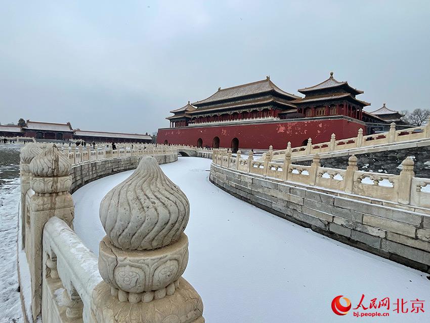 人民網(wǎng)北京1月20日電 (尹星云)今天是大寒節(jié)氣,北京迎來2022年第一場(chǎng)雪,故宮被白雪覆蓋,更顯出古建筑的魅力,引得眾多游客前來拍照游玩。