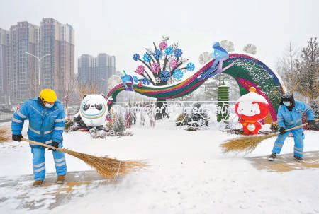 昨天,京城再度飄雪,在東六環(huán)西側(cè)路冬奧主題花壇附近步道上,環(huán)衛(wèi)工在清除步道積雪。本報(bào)記者 方非攝