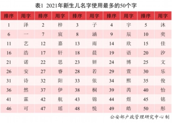 報(bào)告顯示,2021年出生并已經(jīng)進(jìn)行戶籍登記的新生兒名字中,使用頻率最高的50個(gè)字依次為澤、梓、子、宇、沐等。