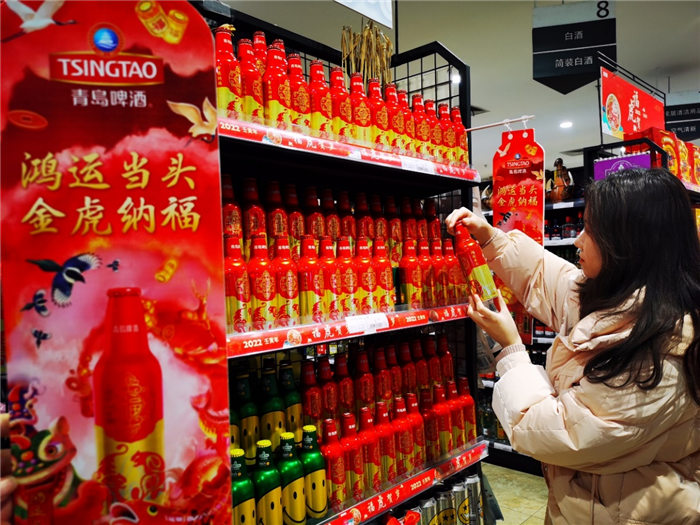 年味不僅是物質(zhì)上的豐富,也有文化上的追求。“過(guò)年就買(mǎi)‘鴻運(yùn)當(dāng)頭’,圖個(gè)好彩頭?!毕M(fèi)者王先生每年過(guò)年都會(huì)“鴻運(yùn)當(dāng)頭,先囤一波”,作為年夜飯的“必選項(xiàng)”。“年夜飯必須紅紅火火,不管是名字還是包裝,鴻運(yùn)當(dāng)頭就是喜慶,而且酒也好喝,每年還出不同的生肖版,我都收藏著著呢?!痹S多消費(fèi)者表示,這款青島啤酒成為春節(jié)當(dāng)之無(wú)愧的“鴻運(yùn)”年貨,走親訪友拎上一提,年味就出來(lái)了。