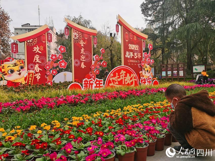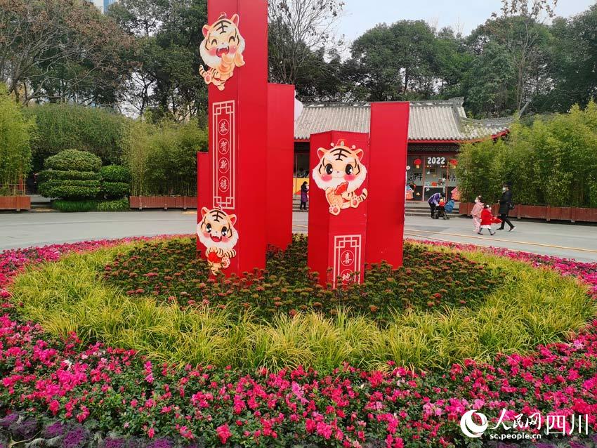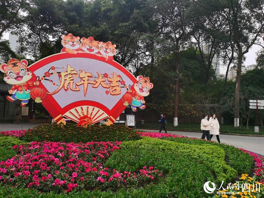 園內(nèi)的幾處空地上,布置了幾個花壇。上邊除了吉祥的紅黃色彩,還有可愛的動漫形象老虎圖案。“虎年吉祥”“金虎迎春”“新年快樂過年好”……各種好彩頭的詞語,標(biāo)示出歡度春節(jié)的主題,看了讓人精神為之一振。