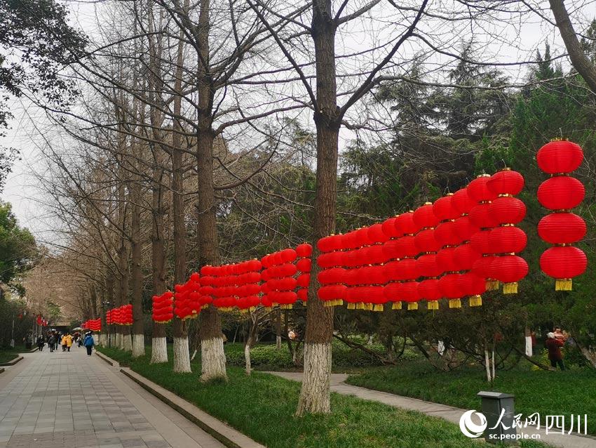 公園的大門布置成了喜慶的大紅色,門上門旁掛滿了紅燈籠。一串四個紅燈,既可以理解為“四季平安”,也可以理解為“四季發(fā)財”,還可以理解成“四平八穩(wěn)”……中國文化的詩意內(nèi)涵,可以激發(fā)出人們更多的想象力。