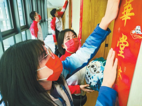 服務保障人員的村內(nèi)生活也趣味十足。下午3點多,一場“守海陀歲·延慶冬奧村新村民共贏未來”主題活動在訪客中心舉行?!拔⑿Φ难瑸榇蟮亻_花;愛灑向手心,純潔無瑕……”中外志愿者們用12種語言唱起北京冬奧會志愿者之歌《燃燒的雪花》,擊鼓傳花,匿名交換明信片,現(xiàn)場溫馨又熱鬧。而在媒體中心,志愿者寫福字,貼福字,迎接春節(jié)和冬奧的到來。晚上6點多,延慶冬奧村還迎來了“志愿者虎年春節(jié)聯(lián)歡晚會”,志愿者各顯身手帶來彈唱、傳統(tǒng)曲藝、芭蕾舞表演等節(jié)目,以“線上村晚”開啟新的一年。