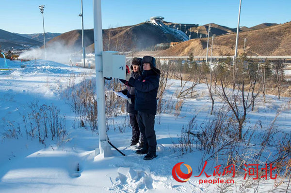 廊坊電力冬奧保障團隊李小虎(右)和同事在國家越野滑雪中心賽道上檢查高壓配電室。 鄒明攝