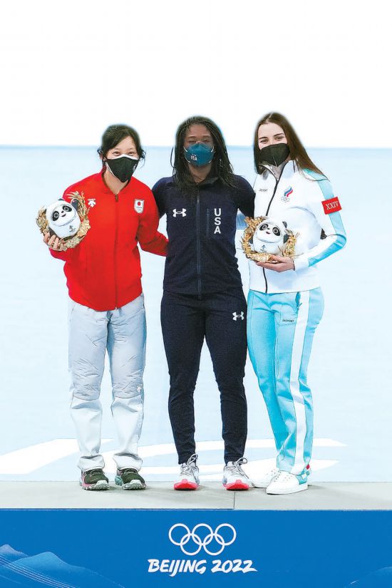 2月13日,北京2022年冬奧會速度滑冰女子500米決賽冠亞季軍選手合影。本報(bào)記者 鄧偉攝