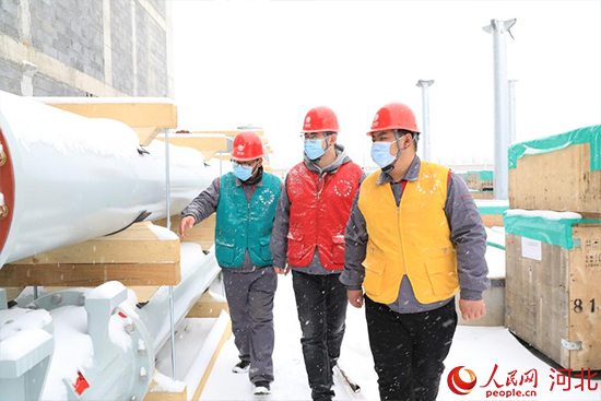 雄東500千伏變電站工程復(fù)工前項(xiàng)目管理人員對GIS設(shè)備存放區(qū)進(jìn)行檢查。 王海軍攝