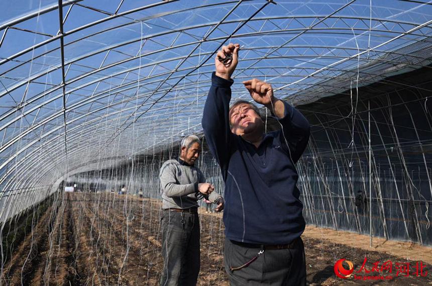 永清縣相輝果蔬農(nóng)民專(zhuān)業(yè)合作社,員工為西瓜種植綁吊秧繩。劉欣羽攝