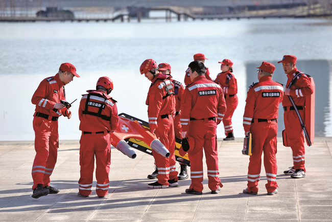 2月24日下午,在嘉興秀湖畔,怡恩公益救援隊組織隊員開展應(yīng)急救援訓(xùn)練,以此提高隊員們的應(yīng)急救援能力。(馮玉坤)
