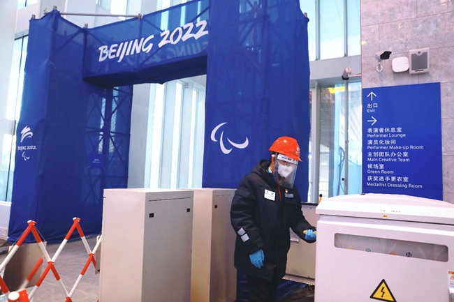 國網(wǎng)北京頒獎(jiǎng)廣場電力保障團(tuán)隊(duì)成員在延慶冬殘奧頒獎(jiǎng)廣場巡視舞臺區(qū)設(shè)備,確保頒獎(jiǎng)儀式供電可靠。張博寧攝