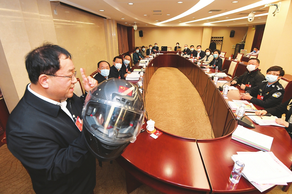 3月7日,山西代表團(tuán)舉行小組會議。呂春祥代表對政府工作報告提出的“今年深入實(shí)施創(chuàng)新驅(qū)動發(fā)展戰(zhàn)略”深感振奮,對“推進(jìn)科技創(chuàng)新,促進(jìn)產(chǎn)業(yè)優(yōu)化升級,突破供給約束堵點(diǎn),依靠創(chuàng)新提高發(fā)展質(zhì)量”充滿信心。他展示了其所在的中科院山西煤化所和山西鋼科碳材料有限公司碳纖維聯(lián)合團(tuán)隊(duì)研發(fā)的TG800碳纖維材料,這一材料應(yīng)用于雪車頭盔,成為今年北京冬奧會上亮眼的山西名片。(記者李聯(lián)軍攝)