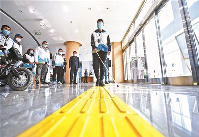 北京2022年冬殘奧會(huì)正在舉行,殘奧運(yùn)動(dòng)員在賽場(chǎng)上的奮勇拼搏贏得了世界的掌聲。作為冬殘奧會(huì)的舉辦地之一,近年來(lái),北京市的無(wú)障礙環(huán)境服務(wù)保障水平顯著提升且更有溫度。昨天,剛啟用不久的北京市殘疾人服務(wù)示范中心(以下簡(jiǎn)稱(chēng)“示范中心”)迎來(lái)了16位城市志愿者。他們?cè)诙瑠W組委無(wú)障礙體驗(yàn)員的帶領(lǐng)下,戴上眼罩體驗(yàn)盲道、坐在匯愛(ài)影廳里“聽(tīng)”電影、體驗(yàn)科技助殘的力量。