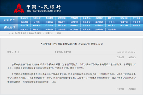 此舉引發(fā)社會各界廣泛關(guān)注,多位業(yè)界人士表示,中央銀行結(jié)存利潤上繳財政,是世界主要經(jīng)濟體的通行做法。就我國而言,2022年政府工作報告明確,要保證赤字率下調(diào)、財政支出增長,人民銀行此舉是在積極落實該項舉措。此舉屬于財政政策范疇,對資金的流動性影響有限,但可經(jīng)直達機制精準到達縣區(qū)基層,對支持助企紓困、穩(wěn)就業(yè)保民生、穩(wěn)定宏觀經(jīng)濟大盤有著積極作用。