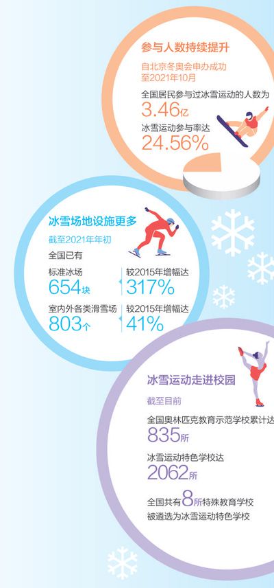 北京冬奧會和冬殘奧會的東風,播撒著冰雪運動的種子,在各地生根萌芽。自申冬奧成功至2021年10月,全國居民參與過冰雪運動的人數達到3.46億,冰雪運動參與率達24.56%,“帶動3億人參與冰雪運動”愿景成為現實。國際奧委會主席巴赫表示,我們歡迎中國成為冰雪運動大國。