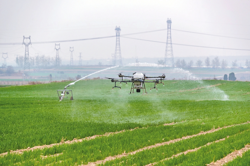3月21日,在運(yùn)城市夏縣胡張鄉(xiāng)新晉村有機(jī)旱作小麥基地,當(dāng)?shù)剞r(nóng)民利用植保無人機(jī)為麥田施肥。眼下正值春耕春管的關(guān)鍵期,夏縣糧農(nóng)搶抓有利農(nóng)時(shí),對全縣31.6萬畝冬小麥開展病蟲草害和極端天氣的應(yīng)對防范,及早動(dòng)手澆水、施肥、噴藥,全面開展春季麥田管理,提高畝產(chǎn)效益,為全年糧食豐收打下堅(jiān)實(shí)基礎(chǔ)。(閆鑫攝)