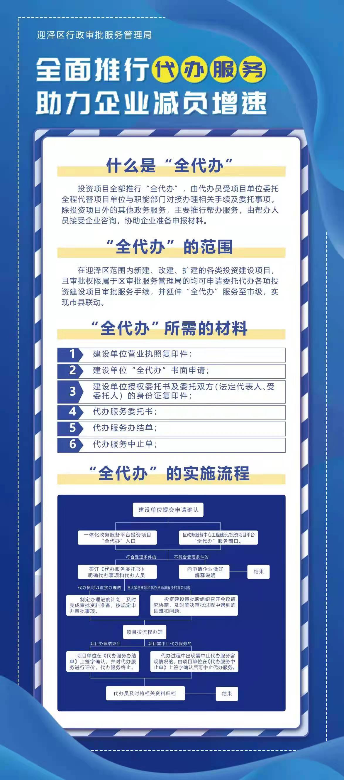 據(jù)介紹,針對項目審批手續(xù)多、時限長等問題,太原市迎澤區(qū)行政審批局梳理堵點痛點,實施流程再造,開展了投資項目建設“全代辦”服務,按照“合法高效、自愿委托、無償服務、全程跟蹤、協(xié)同聯(lián)動”的原則,為企業(yè)提供委托項目一部門辦、一窗入件、一人代跑、一律免費的“全代辦”服務。
