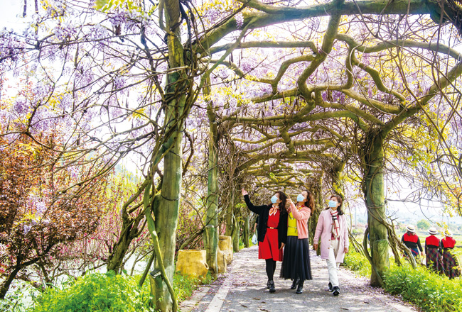 3月29日,在金華市金東區(qū)嶺下鎮(zhèn)釜章村,位于八仙溪邊的百米紫藤長廊花朵綻放,紫藤花從花架垂掛下來,像一串串紫色風(fēng)鈴,吸引了一撥撥游客趁著春光明媚的好天氣前來觀賞拍照。(時(shí)寬兵)