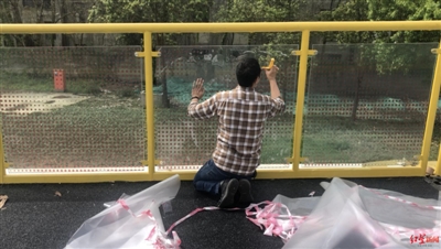 該座天橋大約有三分之一的玻璃護欄已經(jīng)貼上了膜。未貼膜的玻璃護欄有的橫著拉了兩條“警戒線”,有的拉了三條?!耙涣硕嗑镁湍苜N完了”,現(xiàn)場工作人員表示,“警戒線”是臨時措施,貼完膜就會取掉。