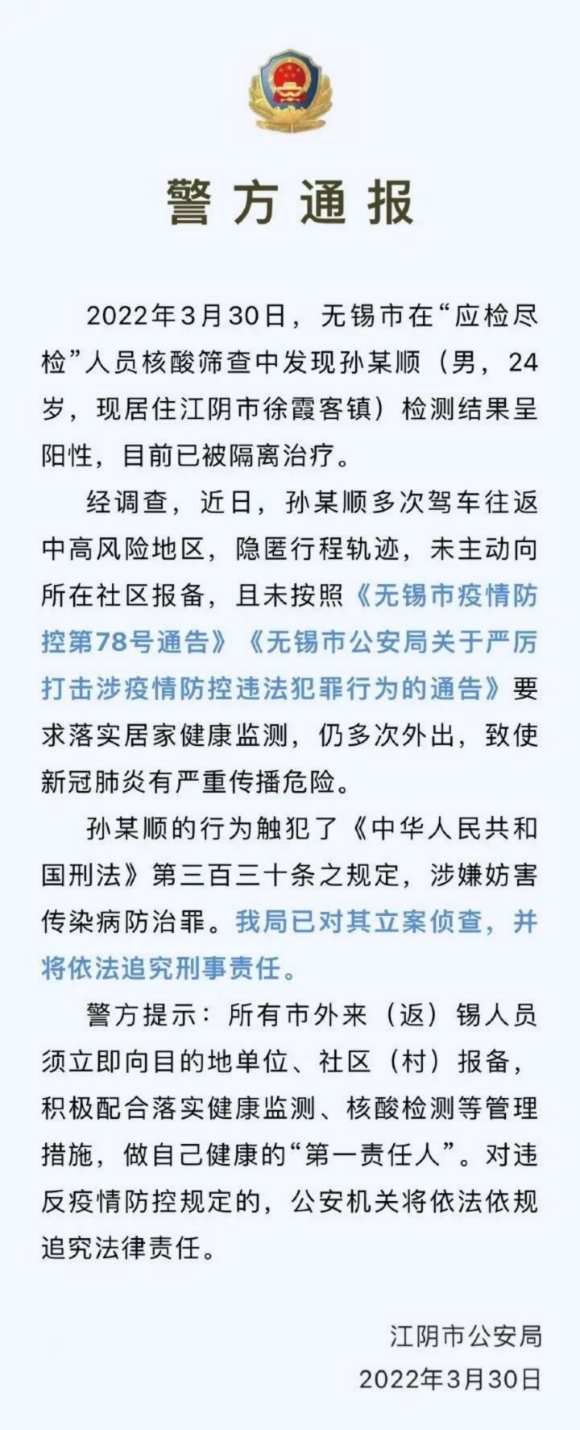 江蘇無錫一陽性男子故意隱匿行程軌跡被刑事立案