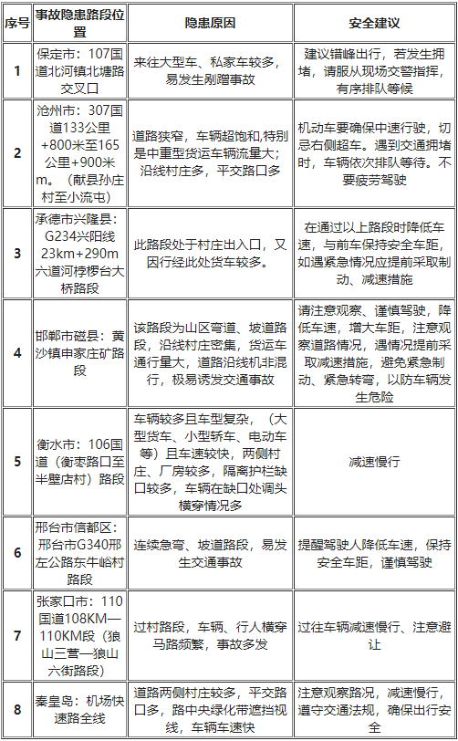有可能出現(xiàn)大流量的站口:石家莊四個(gè)端口站、青銀趙縣口、京港澳七一口、大廣衡水北、首都環(huán)線(張涿段)野三坡、百草畔、百里峽。有可能出現(xiàn)擁堵的互通立交:京臺與京滬互通、新元與京港澳互通(南)。
