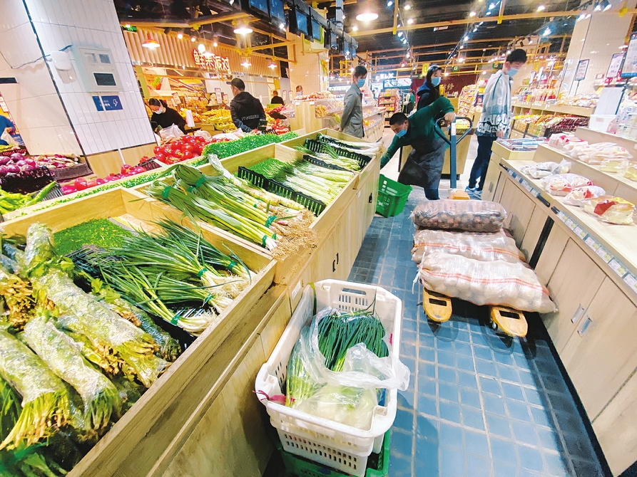4月3日,太原市萬柏林區(qū)千峰南路一家超市內(nèi),工作人員為店內(nèi)貨架補貨,以保障市民正常選購。 記者阮洋攝