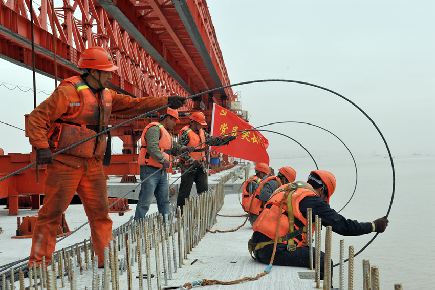 黨員先鋒突擊隊(duì)在魚山大橋建設(shè)現(xiàn)場。舟山市委組織部供圖
