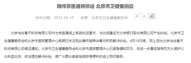 人民網(wǎng)北京4月19日電 據(jù)北京市衛(wèi)健委消息,北京怡合春天科技有限公司作為京醫(yī)通線上系統(tǒng)的運營方,與出資建設(shè)方北京銀行股份有限公司產(chǎn)生糾紛。北京市衛(wèi)生健康委員會和北京市醫(yī)院管理中心前期已關(guān)注到此事并指導(dǎo)當(dāng)事方積極解決糾紛。