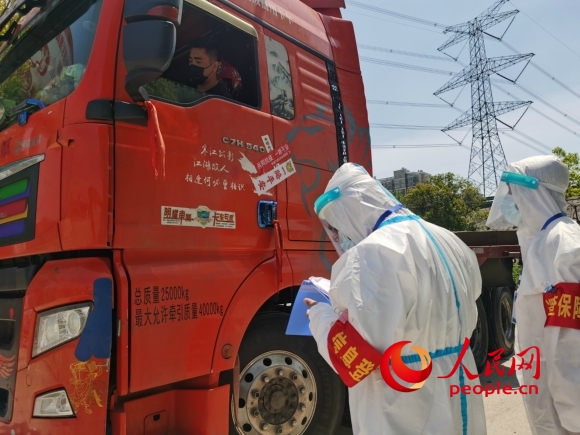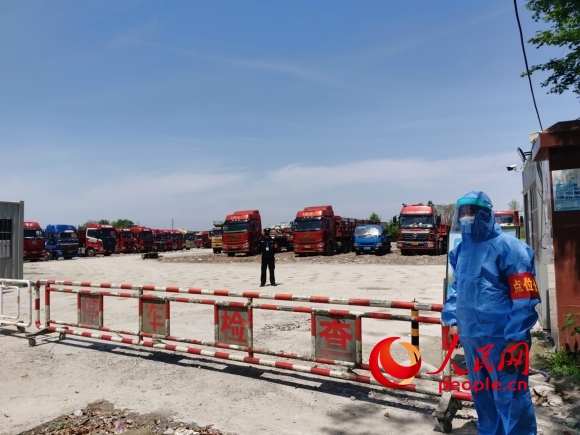 工作人員對外來貨車及駕乘人員進(jìn)行信息登記。人民網(wǎng)記者 王繼亮攝