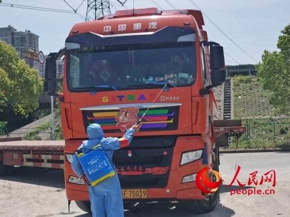 疫情防控人員對外來貨車進(jìn)行消殺。人民網(wǎng)記者 王繼亮攝