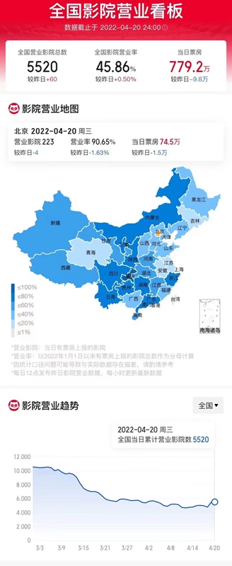 據(jù)國內(nèi)某專業(yè)電影數(shù)據(jù)平臺(tái),4月20日全國影院營業(yè)率45.86%,營業(yè)影院5520家,較上日增加60家,大盤票房779.2萬元。截至4月20日23時(shí),浙江省單日票房(4月20日)約為64萬元,總出票17678張,總場次13722場,平均票價(jià)36元。