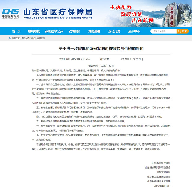 為適應新冠病毒肺炎疫情防控形勢要求,減輕群眾負擔,在已有效降低核酸檢測試劑及配套耗材價格、降低核酸檢測物耗成本基礎上,進一步降低新型冠狀病毒核酸檢測價格。山東省各級公立醫(yī)療機構(gòu)、縣級以上疾病預防控制機構(gòu)新型冠狀病毒核酸檢測單人單檢(含檢測試劑)最高價格為24元/次;按照衛(wèi)生健康部門技術規(guī)范進行的新型冠狀病毒核酸混合檢測,不區(qū)分樣本數(shù)量,最高價格為4元/人次,不得另外收取檢測試劑等其他費用。