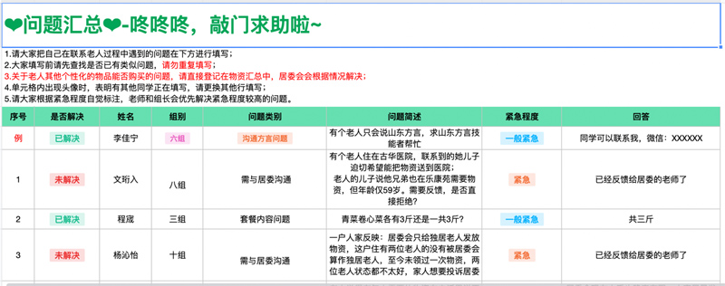 在溝通過(guò)程中,志愿者時(shí)常遇到語(yǔ)言不通、交流不暢等問(wèn)題,他們用耐心努力克服困難。2020級(jí)翻譯專(zhuān)業(yè)的方可昕在溝通過(guò)程中收到了丁女士的求助,她的奶奶98歲高齡,獨(dú)居家中,因?yàn)槔先艘暳Α⒙?tīng)力都有障礙,也不會(huì)使用電子設(shè)備,家人非常擔(dān)心……丁女士聲音哽咽,方可昕感到揪心。她一邊安撫丁女士,記錄需求,并在文檔中標(biāo)注為“非常緊急”。情況提供到“核心team”微信群后,小區(qū)在地志愿者陳天瑋立即趕往現(xiàn)場(chǎng),大約十分鐘就收到了反饋:老人安全無(wú)恙。為了更加詳細(xì)了解老人的情況,方可昕與丁女士共通了9次電話(huà)。