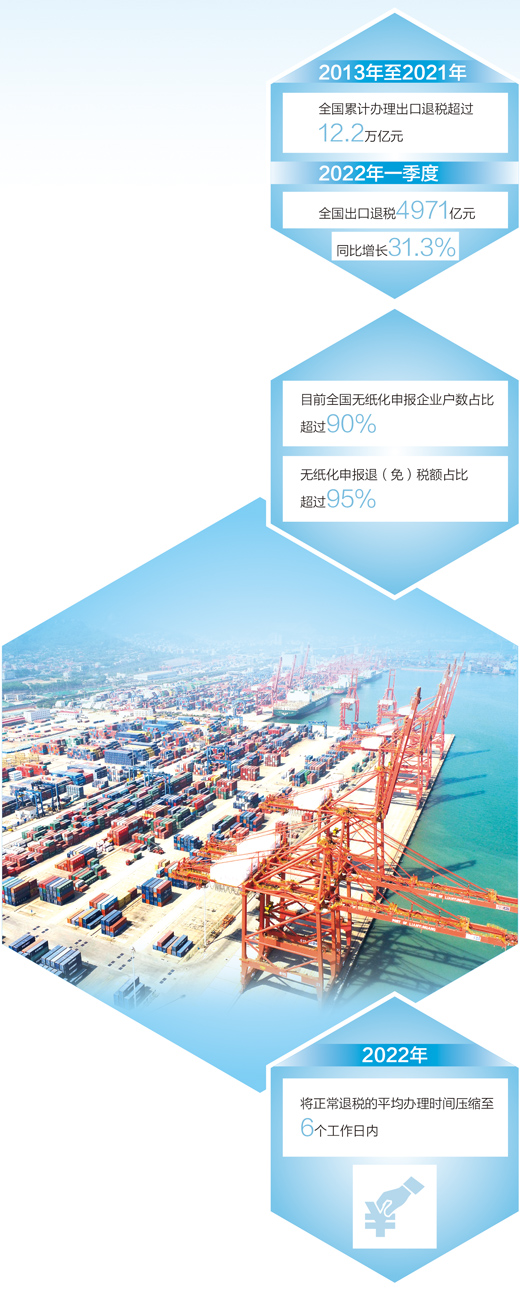 近年來,稅務(wù)總局持續(xù)擴(kuò)大無紙化申報(bào)覆蓋范圍,大幅減輕出口企業(yè)申報(bào)負(fù)擔(dān)。目前,全國無紙化申報(bào)企業(yè)戶數(shù)占比超過90%,無紙化申報(bào)退(免)稅額占比超過95%;稅務(wù)總局正會(huì)同相關(guān)部門研究推出進(jìn)一步提高出口退稅便利度等支持舉措,2022年內(nèi),正常退稅的平均辦理時(shí)間將壓縮至6個(gè)工作日內(nèi)。