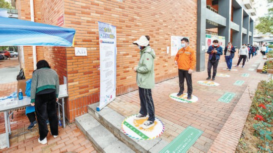 本報訊(記者 李瑤)昨天,東城區(qū)東四街道在轄區(qū)內(nèi)5個常態(tài)化核酸檢測點推出新式“兩米線”,通過充滿童趣的“呼啦圈”地貼,引導(dǎo)居民有序排隊,保持安全距離。“呼啦圈”直徑大約80厘米,中間黃色腳印圖案十分醒目,旁邊還印有疫情防控科普貼,居民站在圈內(nèi)有序排隊等待核酸檢測?!啊粌H富有童趣,使排隊等候不再那么乏味,還嚴(yán)格規(guī)定了排隊距離,保證大家的安全?!本用顸c贊說。本報記者 鄧偉攝