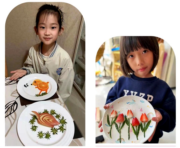 黑芝麻胡同小學(xué)學(xué)生展示和家長(zhǎng)一起制作的水果拼盤