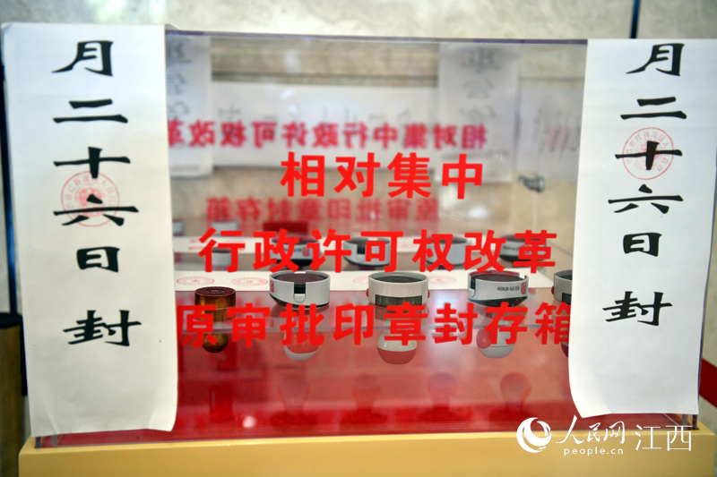 南昌紅谷灘區(qū)設(shè)立“難事直通車”專窗,優(yōu)化營(yíng)商環(huán)境。圖為紅谷灘區(qū)行政審批局內(nèi)展示封存的原審批印章。人民網(wǎng) 時(shí)雨攝