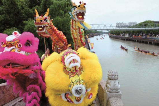 自2018年以來,每年的端午節(jié),嘉興桐鄉(xiāng)都在崇福鎮(zhèn)舉辦端午民俗風(fēng)情活動(dòng),這已是第五屆?;顒?dòng)分為“民俗展演”“端午民俗秀”“宋韻風(fēng)情展”“宋韻文創(chuàng)美食集”四大主題,包括運(yùn)河鼓舞、龍獅、大纛旗表演、“年年有魚”魚燈表演、“風(fēng)雅桐鄉(xiāng)十二樂章”龍舟競渡、“舌尖上的端午”美食雅集等15項(xiàng)活動(dòng),從早上9時(shí)30分啟動(dòng),一直延續(xù)到晚上8時(shí)。