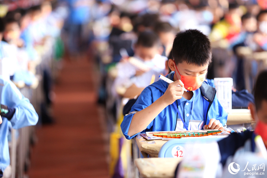 活動(dòng)現(xiàn)場(chǎng),選手們列隊(duì)進(jìn)入各自賽場(chǎng),用畫(huà)筆在龍舟模型素材板上畫(huà)出各式圖案,再將一個(gè)個(gè)零部件手工拼接,組裝成一條條獨(dú)具特色的“小龍舟”,船體或是金銀鱗甲,或是祥云波浪,色彩斑斕,風(fēng)格不一。