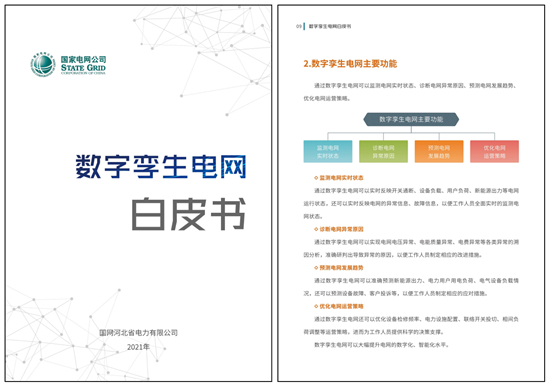 2021年7月,國網(wǎng)河北電科院聯(lián)合多家單位編制完成并發(fā)布了國內(nèi)電網(wǎng)領(lǐng)域首個《數(shù)字孿生電網(wǎng)白皮書》。白皮書歸納總結(jié)了雄安數(shù)字孿生建設(shè)成果,系統(tǒng)闡述了數(shù)字孿生電網(wǎng)的主要功能、體系架構(gòu)以及維護管理方式等內(nèi)容,創(chuàng)造性地提出了數(shù)字孿生電網(wǎng)的技術(shù)架構(gòu)和技術(shù)實現(xiàn)方式,對今后數(shù)字孿生技術(shù)在電網(wǎng)領(lǐng)域的探索應(yīng)用具有較強的指導(dǎo)意義。