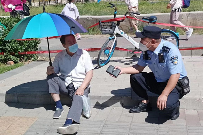 看到老人左腿從胯部開始已經(jīng)扭曲,無法動彈,馬占富勸說兩位老人:“這么大歲數(shù)摔倒可不是鬧著玩的,自行移動容易引起二次傷害。”隨后,他撥打了120急救電話,疏散了圍觀群眾,還從車里拿來一把遮陽傘為老人遮擋陽光。
