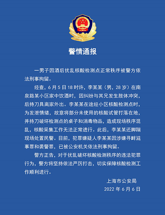人民網(wǎng)上海6月6日電 (王文娟)據(jù)上海市公安局通報(bào),一男子因酒后擾亂核酸檢測(cè)點(diǎn)正常秩序被警方依法刑事拘留。