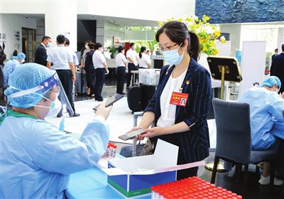 因新冠疫情防控需要,此次黨代會(huì)實(shí)行全程閉環(huán)管理。“請(qǐng)您先測(cè)一下體溫?!惫ぷ魅藛T熱情地引導(dǎo)著。代表們佩戴口罩,保持間距,有序完成測(cè)溫、驗(yàn)碼、安檢、流調(diào)、核酸檢測(cè),隨后全身心投入到參會(huì)各項(xiàng)準(zhǔn)備工作。