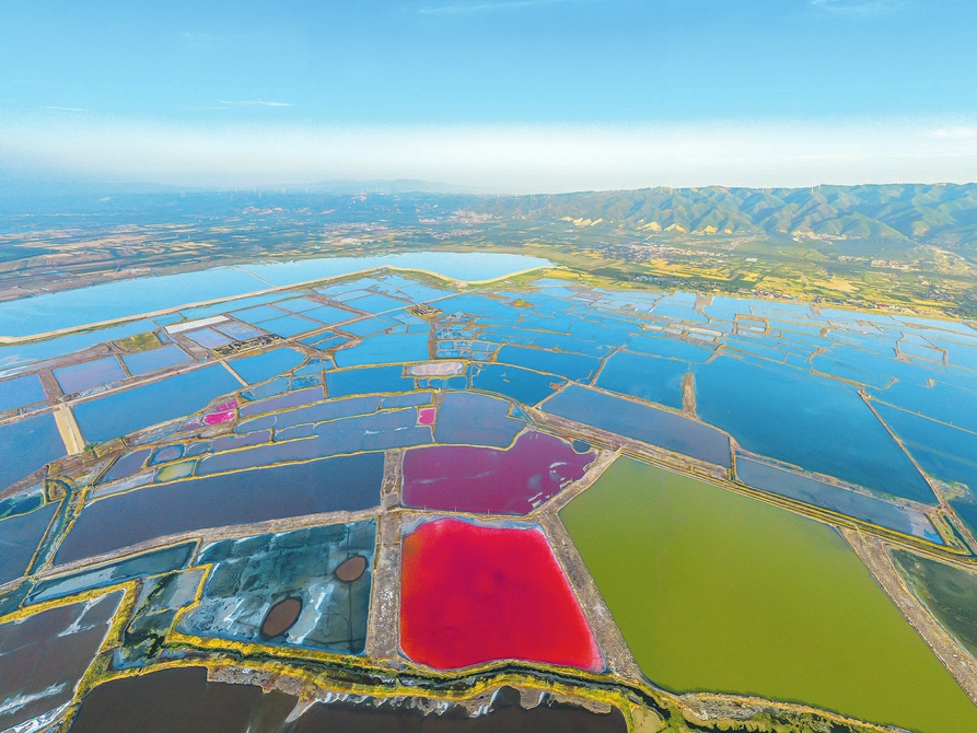 仲夏時節(jié),隨著氣溫升高,運城鹽湖濕地呈現出色彩斑斕的美麗景觀。近年來,運城市大力實施“退鹽還湖”“還湖于民”生態(tài)修復工程,把鹽湖從礦區(qū)、工業(yè)區(qū)變?yōu)樯鷳B(tài)保護區(qū)、旅游區(qū)。(閆鑫攝)
