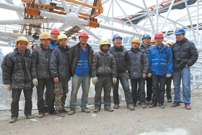 “中國(guó)天眼”索網(wǎng)合攏時(shí),南仁東(左七)、姜鵬(右一)與現(xiàn)場(chǎng)施工人員一起合影留念。